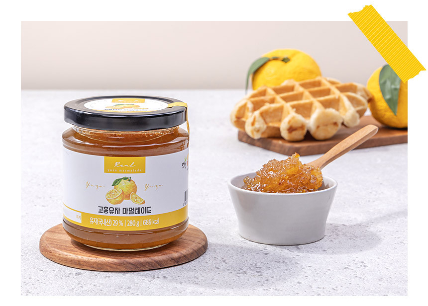 자연의 유자를 그대로 담은 고흥유자 마멀레이드는 건강하고 가볍게 즐길수 있는 마멀레이드입니다. 상큼한 과육이 입안 가득 씹히는 유자마멀레이드는 고흥에서 무농약 재배한 유자와 과육을 가득 넣어 만들었습니다. 알갱이 없는 잼이 식상하셨다면 고흥유자 마멀레이드로 과육을 충분히 느껴보세요. 어떠한 합성첨가물도 넣지 않은 건강한 마멀레이드로 남녀노소 누구나 건강하게 즐길 수 있습니다. 고흥유자 마멀레이드는 기내식으로 들어가는 건강하고 간편한 식품입니다.