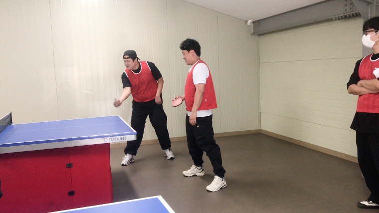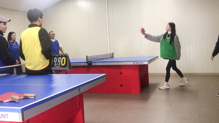 네 번째 종목으로 탁구 경기가 이어졌습니다. 남녀 혼성 복식으로 진행된 탁구 경기는 A동 탁구장에서 치러졌으며, 1세트는 남남 복식, 2세트는 남녀 복식으로 구성되어 3판 2선승제로 승부를 가렸습니다. 치열한 경쟁 끝에 1조 초록팀이 1등을 하였습니다.