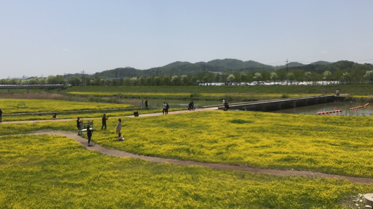축제장에 도착하기 전, 제 시선을 완전히 사로잡은 것은 무심천을 따라 끝없이 펼쳐진 황금빛 유채꽃밭이었습니다. 드넓은 꽃밭은 마치 거대한 유화 물감으로 칠해 놓은 듯 눈부셨고, 잔잔한 바람에 일렁이는 꽃잎들의 모습은 그야말로 장관이었습니다. 톡톡 터지는 듯한 선명한 노란색은 보는 이들의 마음까지 환하게 밝혀주는 듯했습니다.